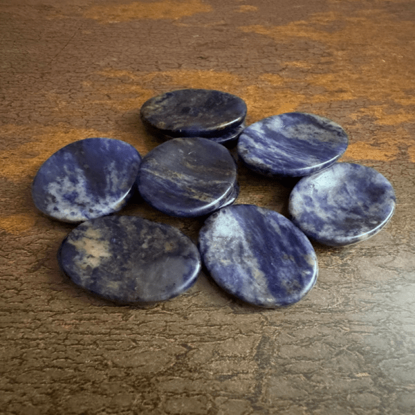 The Sodalite Serenity Worry Stone is a polished piece of natural sodalite, renowned for its deep blue color with contrasting white or grayish veins. This worry stone is designed to offer both aesthetic appeal and practical benefits. With its smooth, thumb-indent surface, it is perfect for rubbing to relieve stress and promote mental clarity. Sodalite is celebrated for its ability to bring harmony and insight, making it a valuable tool for emotional balance and mental focus.