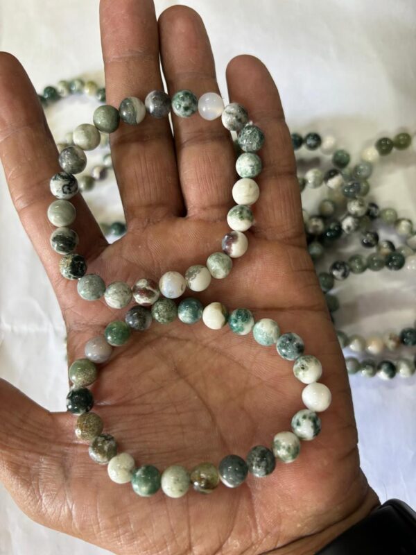 The Tree Agate Harmony Bracelet features beads made from tree agate, a unique variety of chalcedony characterized by its green and white banded patterns that resemble tree branches or foliage. The bracelet typically showcases smooth, polished tree agate beads, and may be designed with a simple, natural aesthetic or enhanced with metal accents and additional gemstones for added elegance.